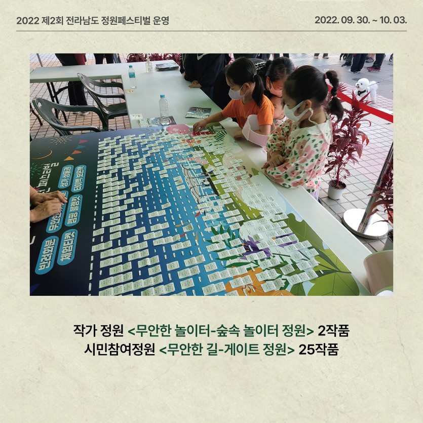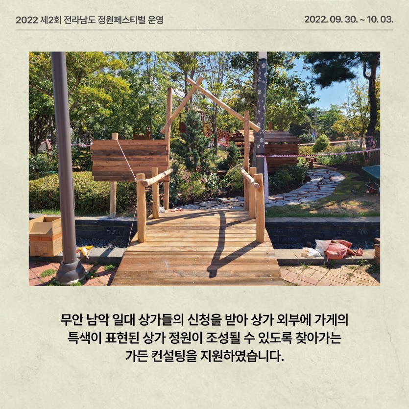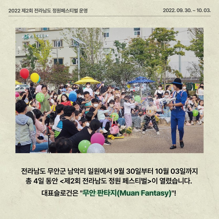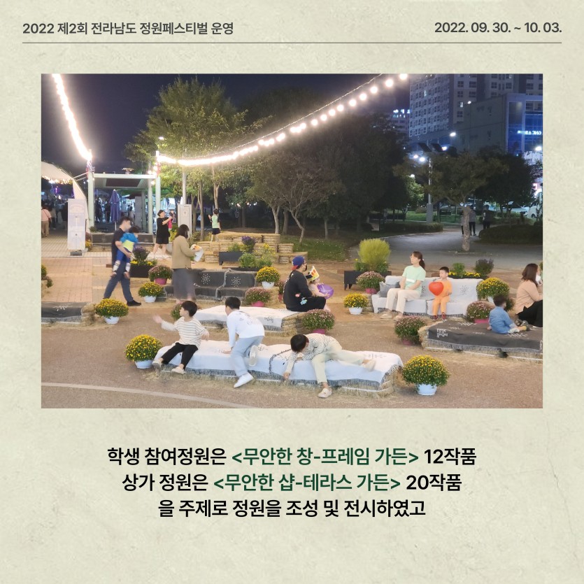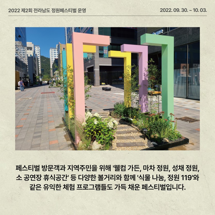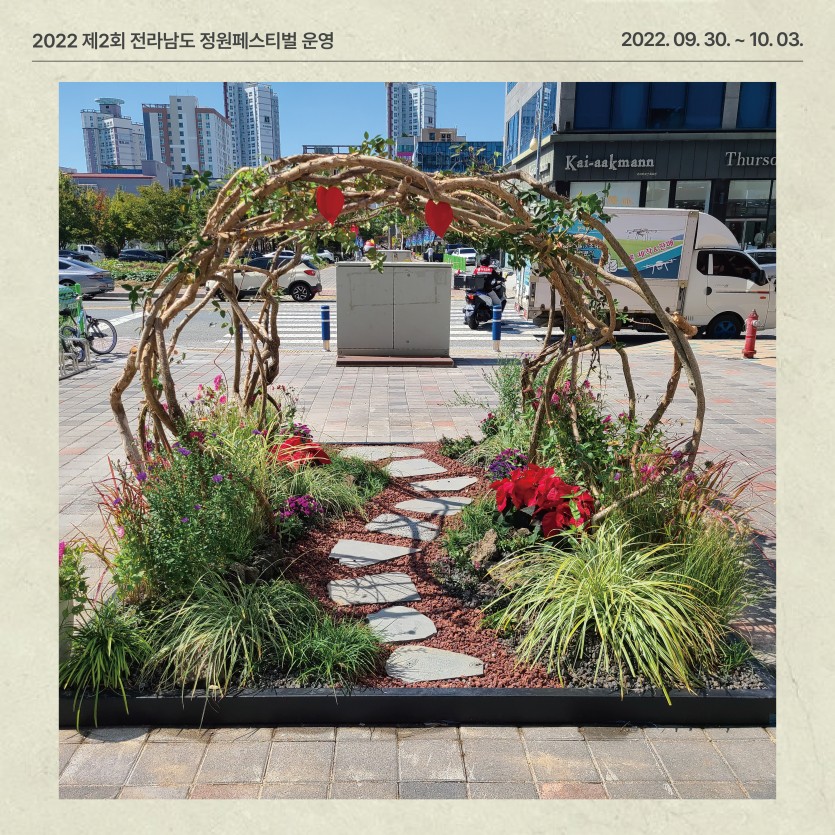 (2022) 제2회 전라남도 정원 페스티벌 운영 페이지 정보 작성자관리자 댓글 0건 조회 756회 작성일 24-03-11 16:42 본문 ● 행 사 명 : 제2회 전라남도 정원페스티벌 ● 장 소 : 무안군 삼향읍 남악리 김대중광장 일원 목록 이전글생활정원 (순천 오천그린광장) 조성 24.03.11 다음글제1회 전라남도 정원 페스티벌 운영 24.03.11