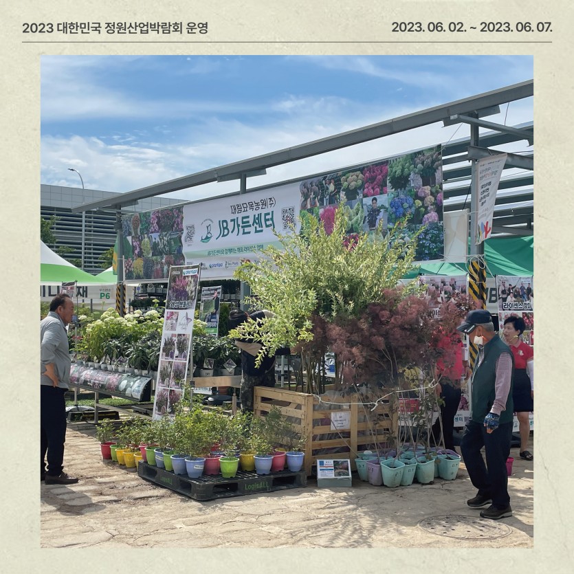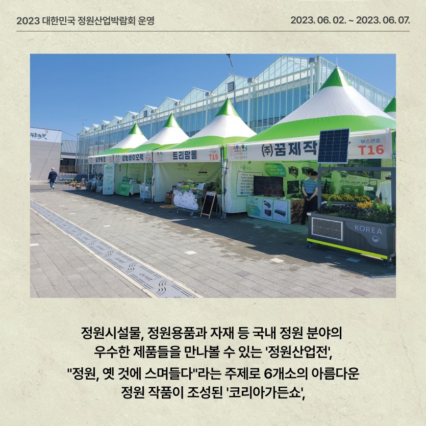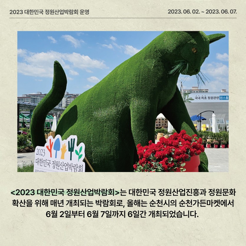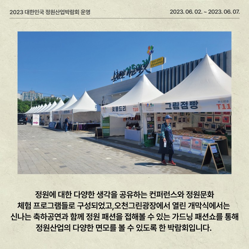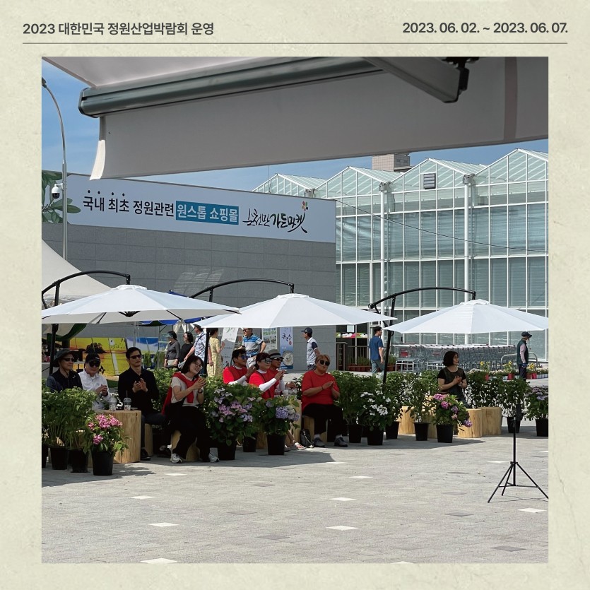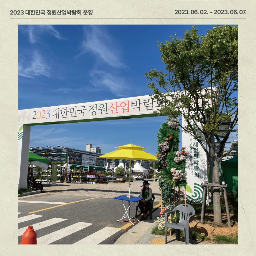 (2023) 대한민국 정원산업박람회 운영 페이지 정보 작성자관리자 댓글 0건 조회 140회 작성일 24-03-11 16:52 본문 ● 행 사 명 : 2023 대한민국 정원산업박람회 ● 장 소 : 순천만가든마켓 일원 (개막식 : 오천그린광장)● 기 간 : 2023. 6. 2. (금) ~ 6. 7. (수) 목록 이전글제4회 순천만국가정원 화훼장식 경진대회 운영 24.03.11 다음글제3회 전라남도 정원페스티벌 운영 24.03.11