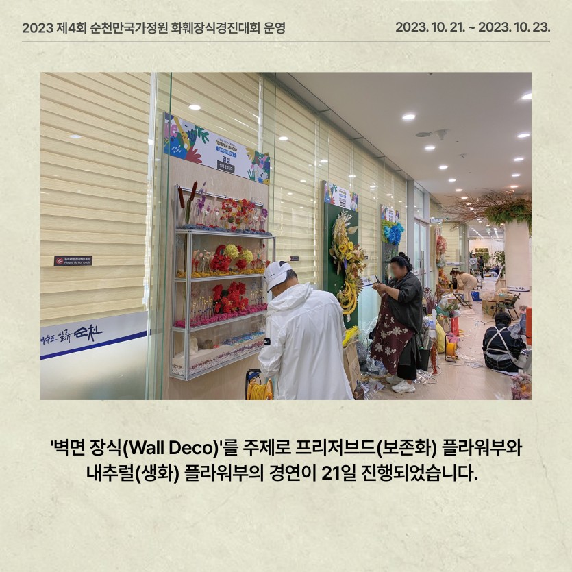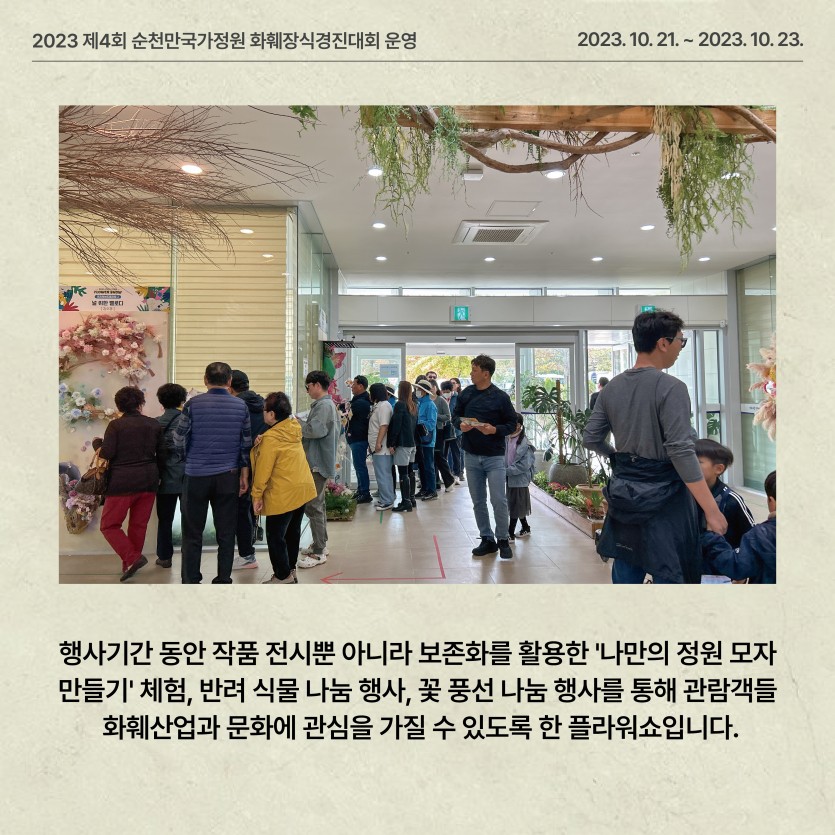 (2023) 제4회 순천만국가정원 화훼장식 경진대회 운영 페이지 정보 작성자관리자 댓글 0건 조회 326회 작성일 24-03-11 16:54 본문 ● 행 사 명 : 제4회 순천만국가정원 화훼장식 경진대회 운영● 장 소 : 순천시정원지원센터● 기 간 : 2023. 10. 21. (토) ~ 10. 23. (월) 목록 이전글오룡 도심권 생활 정원 조성 운영 용역 24.03.11 다음글대한민국 정원산업박람회 운영 24.03.11